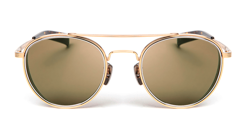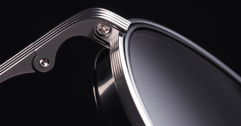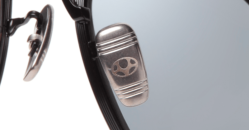 ビンテージフレームでよく見られる風の巻き込みを和らげるレンズサイドに付けられている“フード”を再現したメタル製フードは、鯖江の技術で超高精度にドッキングされている。