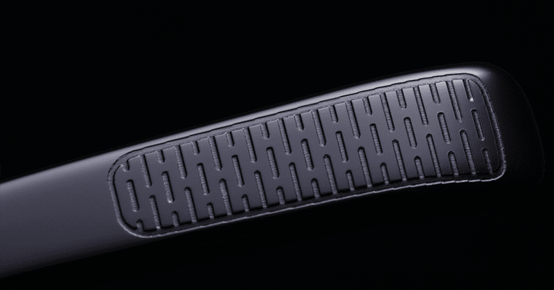 ライン入りパッド表面にブランドアイコンである“カブト”がレーザー彫りで奢られている。