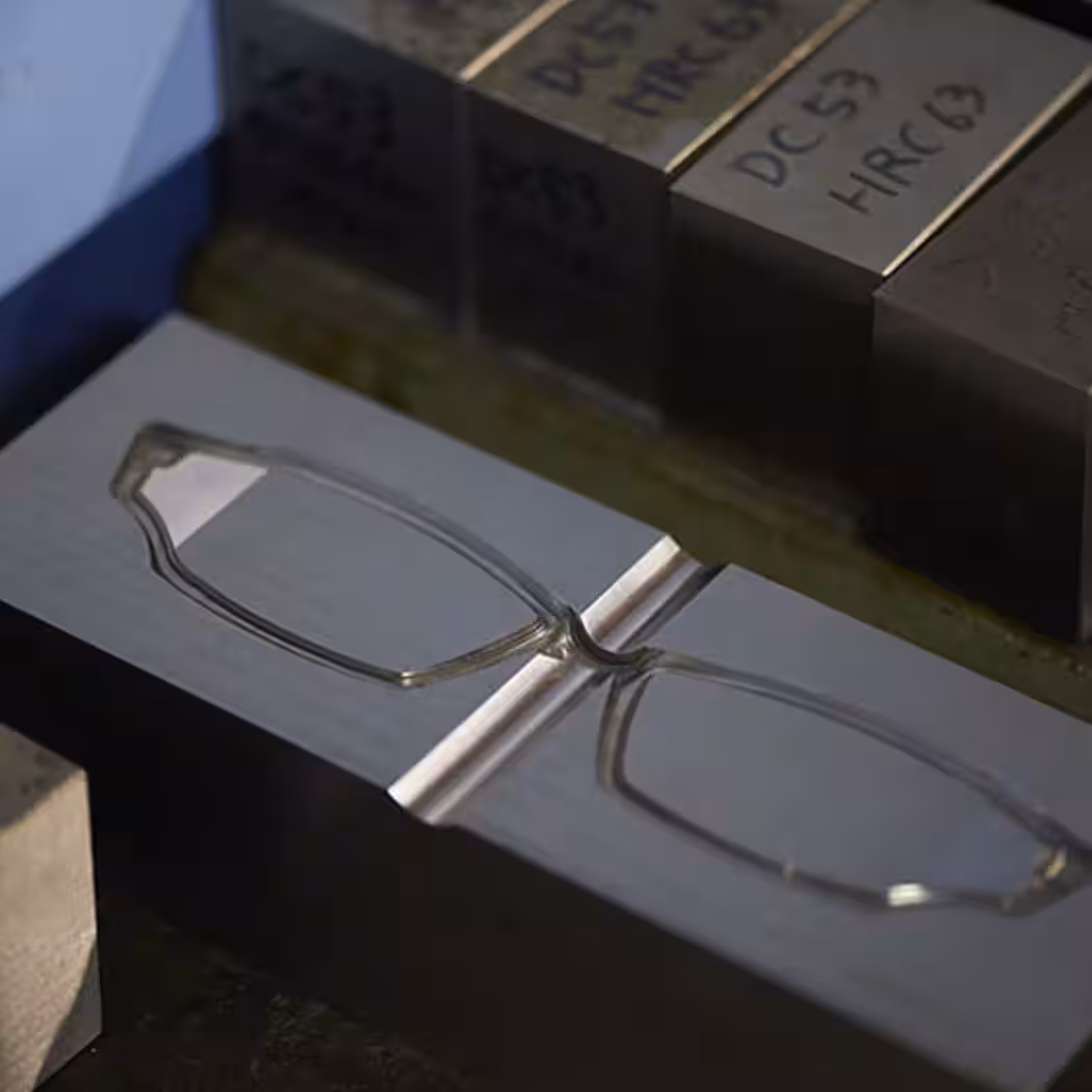 プラスチックフレームは、さまざまな色柄のプラスチック板を工作機で切削し、きさげかけ、やすり掛け、ガラ磨き、ドロ磨きといった方法で削り磨いていきます。同じプラスチックでも、樹脂素材は、決まった金型の中に素材を注入し成形します。