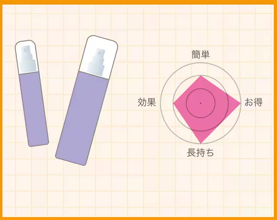 スプレーのポンプは、比較的粒子の小さいミストが均一に噴射される仕組みになっています。さらに、ポンプ部分に指が収まるくぼみを設けることで、メガネを外した状態でも噴射口の位置をわかりやすくしています。
