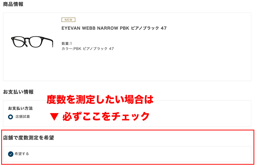 店舗試着が選択されて、店頭でフレームやサングラスを試着した上でレンズを選ぶことができます。「適切なレンズ度数がわからない」「どのレンズがよいか迷っている」「UVカット機能などの相談がしたい」という方は、こちらがおすすめです。度数の測定を希望する場合は、「希望する」の項目に必ずチェックを入れておきましょう。
