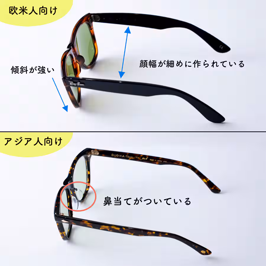 しかし、最近は多くのブランドでアジア人向けのモデルが販売されています。アジア人向けのモデルは、フロントの傾斜が緩やかで鼻当てがついていて、顔幅が広く、テンプルが顔の側面を包み込むようにカーブしています。そのため、日本人がかけても違和感なく顔にフィットするのです。