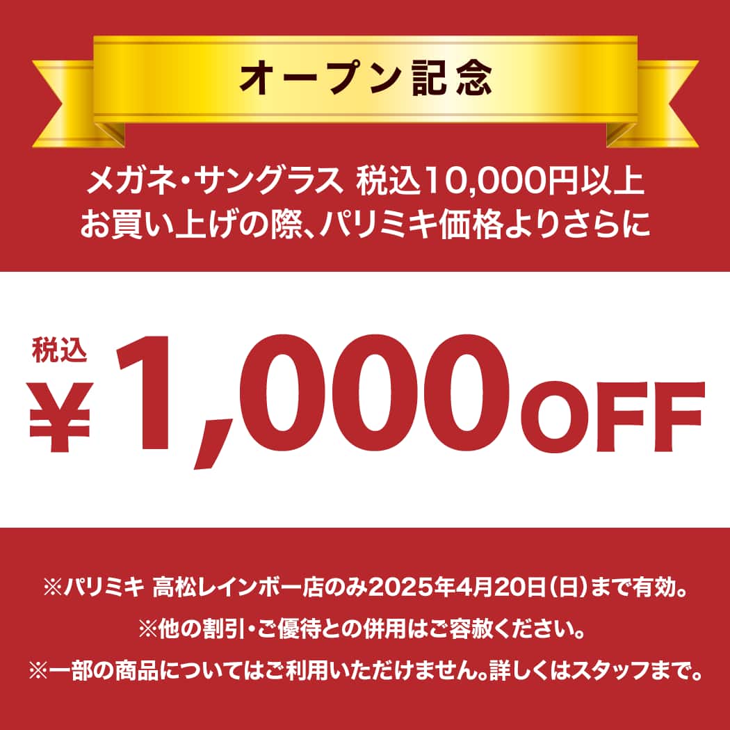 メガネ・サングラスを税込10,000円以上お買い上げの際、パリミキ価格より税込1,000円OFFになるクーポンです。
