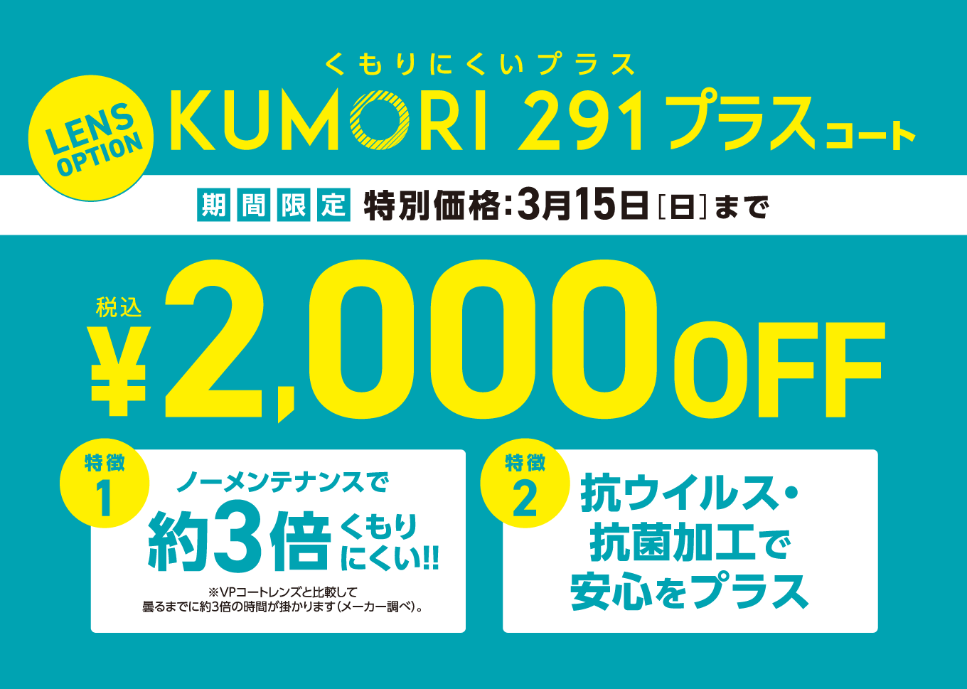 「KUMORI 291プラスコート」は、特別なメンテナンスがいらないくもりにくいレンズコートです。