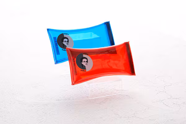そもそもはメガネを入れるケース。なるべく軽く、かさばらないような形を追求した結果、口金付きのこんなスタイルになりました。試作品をつくってみたところ、マルチな用途に使えることが判明。筆箱、サプリメント入れ、ミニ化粧ポーチ、小銭入れなどなど。あっ、歯ブラシセットの携帯にも便利です。ビニールクロスの赤と青が、50’sのレトロ感覚を呼び起こします。