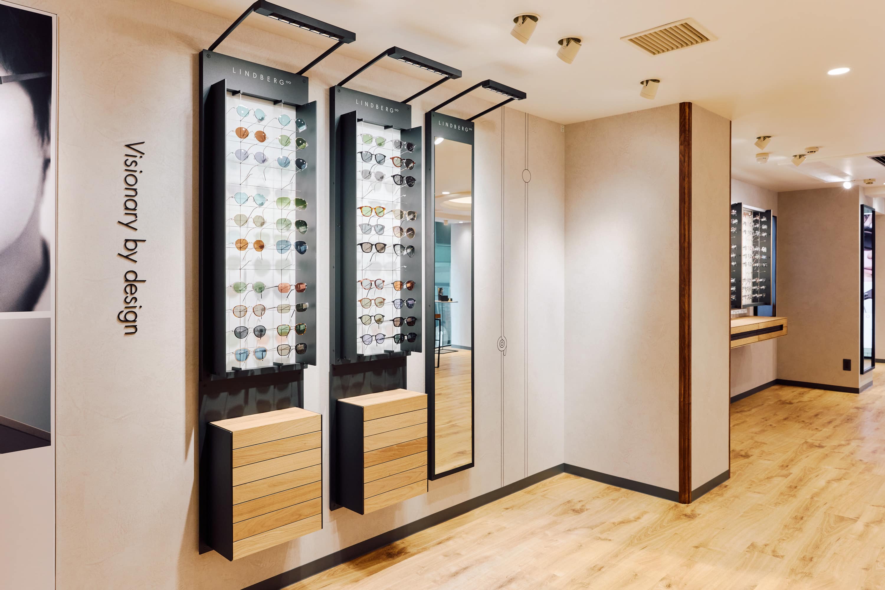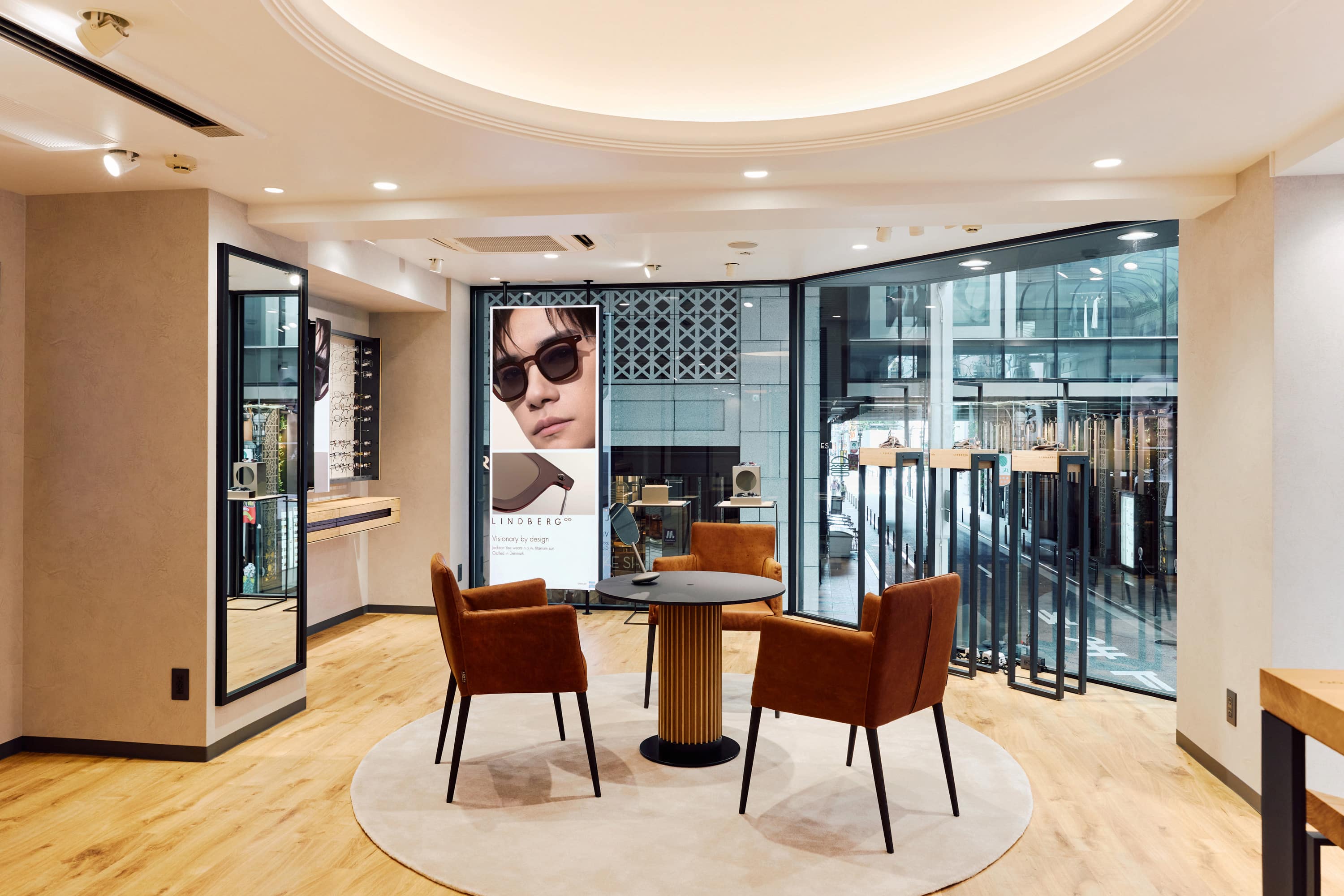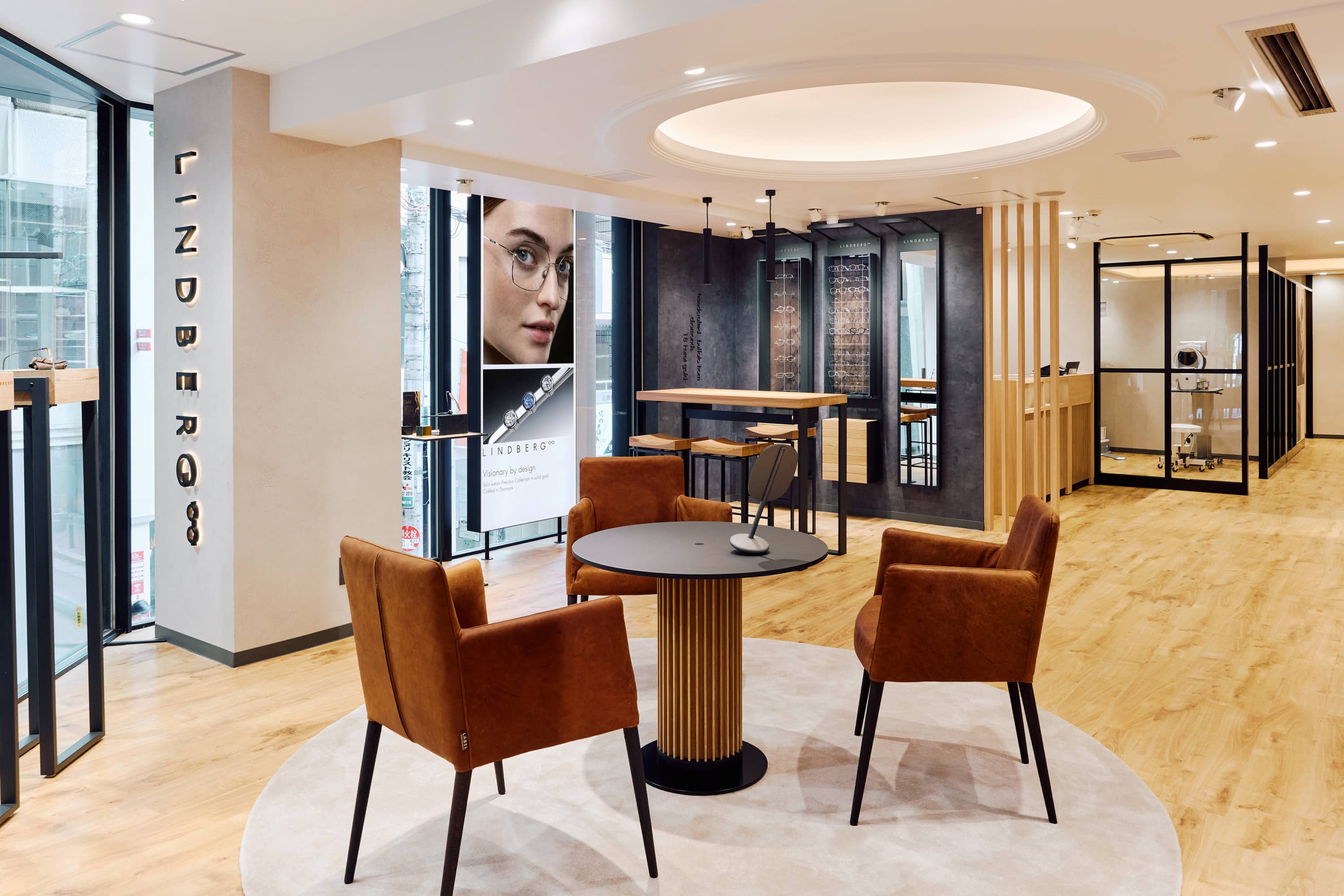 “Visionary by design”というリンドバーグのブランド哲学に基づき、新たな店舗スペースのビジュアルプレゼンテーションはブランドのアイコニックなスタイルを体現しています。大きなフロアから天井までの窓は、スカンジナビアデザインの象徴であり、店内に自然光を取り込み、通りに向かって温かく心地よい光を放ちます。 店内には、ホワイトオークとスモークドオークを使用した“Tailormade 2.0”キャビネットが配され、光学フレーム、サングラス、そしてエクスクルーシブな「Precious(プレシャス)」コレクション を含む、リンドバーグのクラシックなアイウェアコレクションの全ラインアップを展開します。さらに、2つの専用検眼室を備え、デザインの選定から視力測定、そして精密なフィッティングまでを一貫して提供するシームレスな体験を実現しています。
