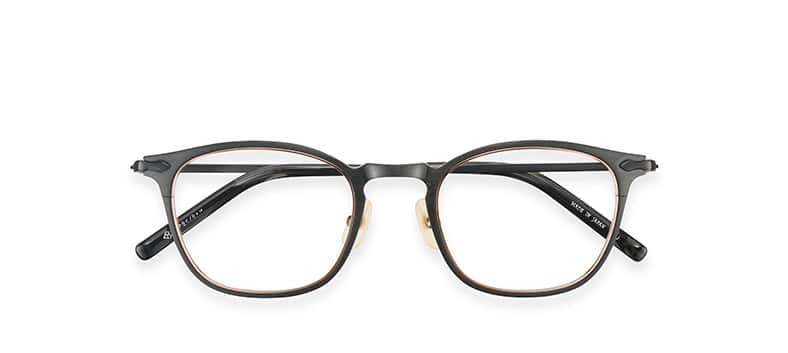 リムの内側に更にメタルリムを組み合わせた非常に珍しいメタルインメタルのウェリントンモデル。角度によりさりげなくインナーリムのカッパーカラーが光るコンセプチュアルなデザインです。極力細くさりげなく仕上げるため、インナーリムパーツには別注のβチタンを使用。「天角」と呼ばれるエッジィなシルエットのブリッジ上部、ブリッジ下部が鍵穴モチーフにしたキーホールカット、乳白カラーのパッドなど、クラシカルな要素を踏襲しながら、フロントパーツをスッキリとしたルックスの一体成型にすることにより、レトロフューチャーなモデルに仕上がっています。