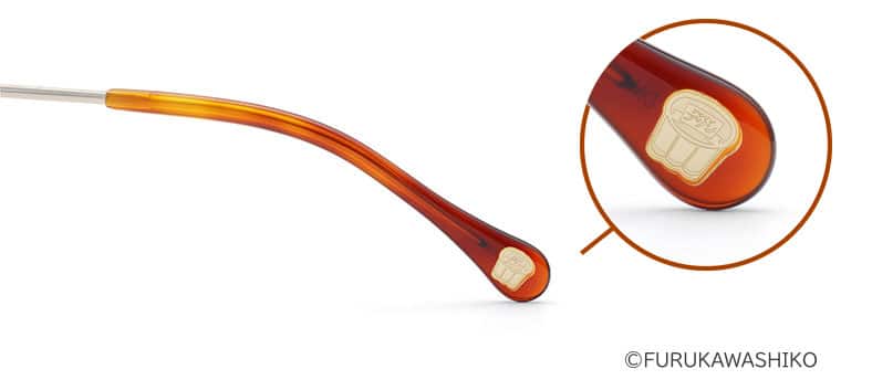 フレーム前枠の色は、それぞれプリンのカラメルソース、チョココロネのクリームをイメージした配色を施し、テンプルにはなつかしい昭和ガラスの柄をイメージした模様を入れています。