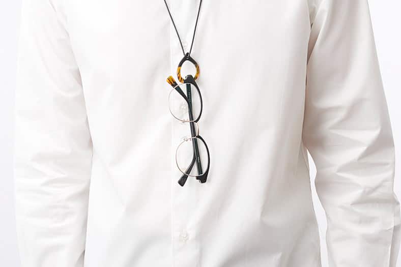 首から下げるメガネホルダー。部は本革、結び目のポイントから長さ調整が可能。ボストンのフレームを半分にしたデザイン。