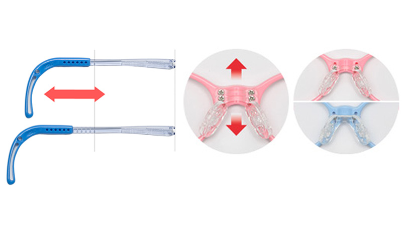 子どもの耳までの長さに合わせて、ジャストのサイズ調節が可能です。 鼻パッドはシリコン製で滑りにくいです。また鼻の高さにあわせて、鼻パッドの取り付け位置を変えるための穴がフロントに複数ついています。