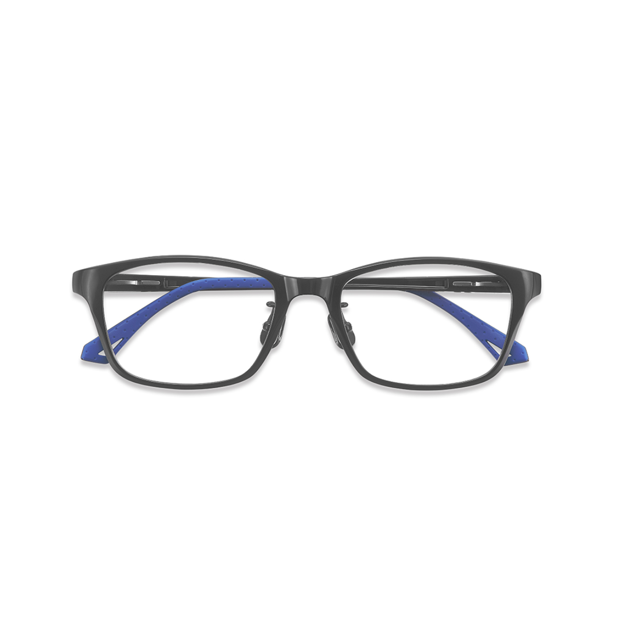 スタンダードなイメージのスクエアタイプ。スッキリしたイメージを与え、仕事でも、スポーツでも使いやすいデザイン。フロントとテンプルをつなぐメタル素材にはステンレスを使い、バネ感を多少もたせつつ、傾斜角、顔幅調整がしやすいようにしています。