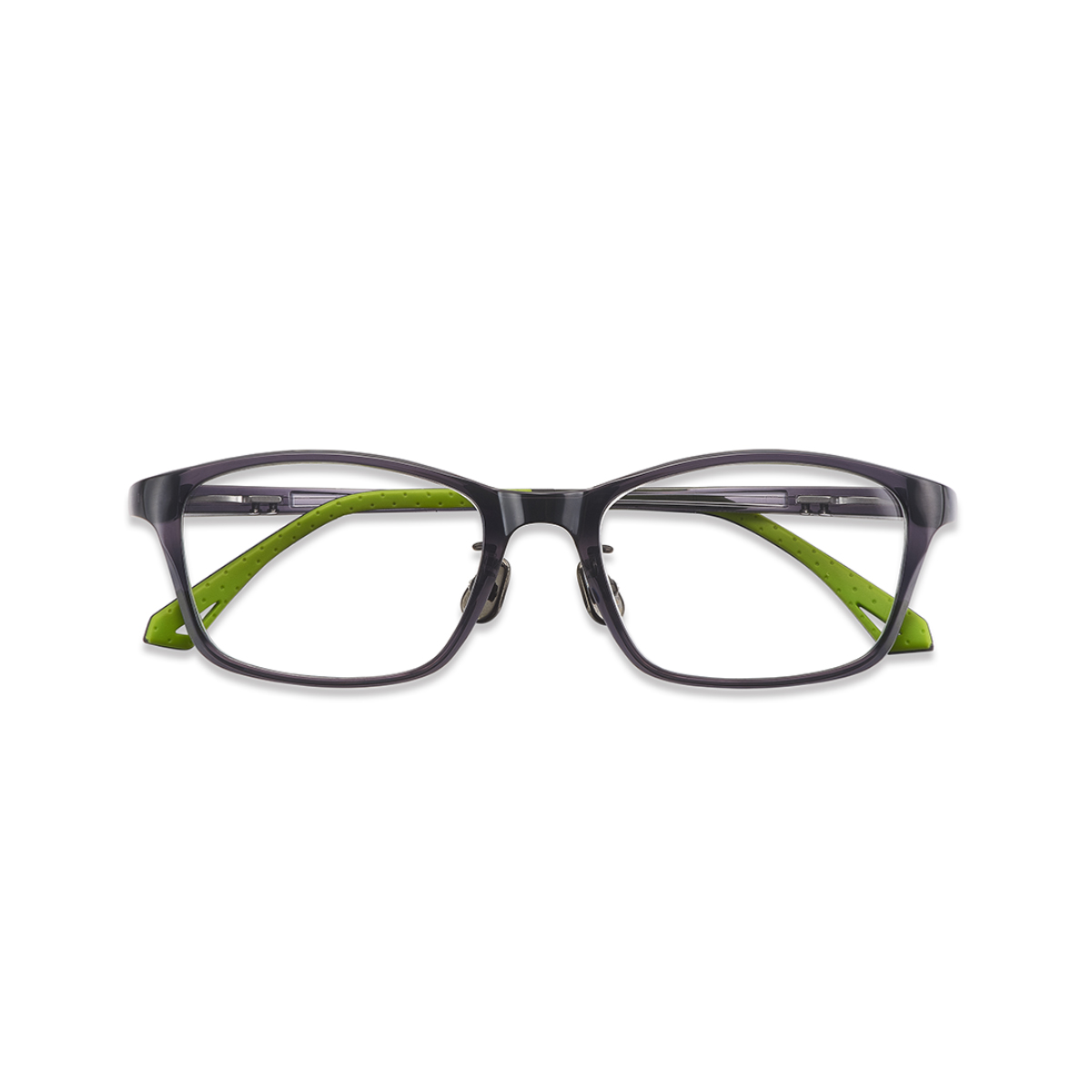 スタンダードなイメージのスクエアタイプ。スッキリしたイメージを与え、仕事でも、スポーツでも使いやすいデザイン。フロントとテンプルをつなぐメタル素材にはステンレスを使い、バネ感を多少もたせつつ、傾斜角、顔幅調整がしやすいようにしています。