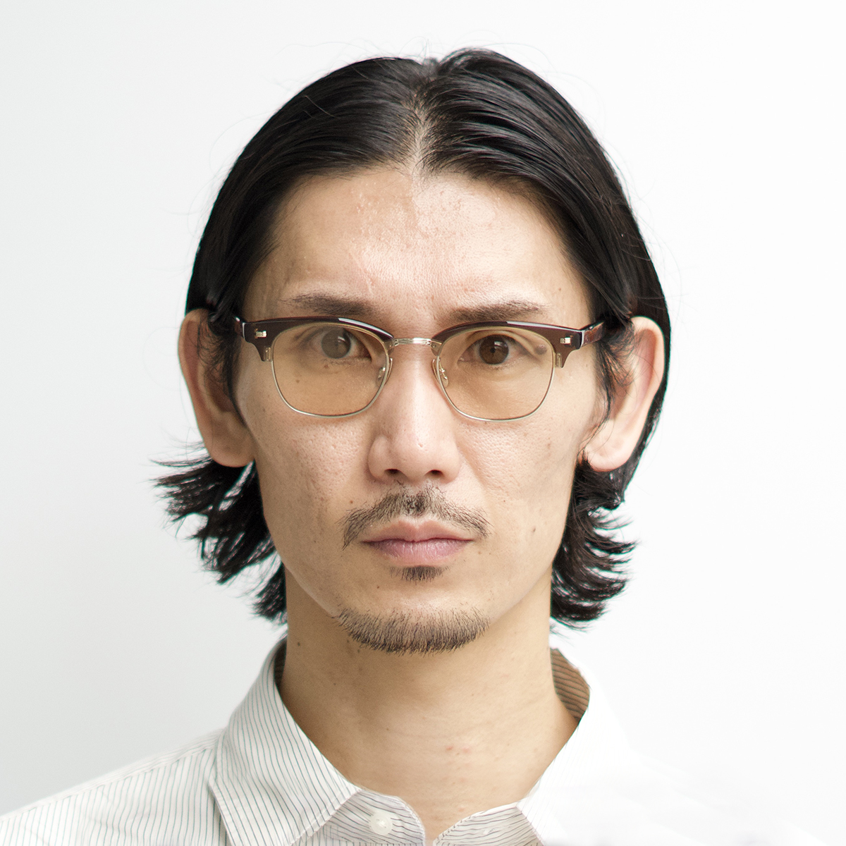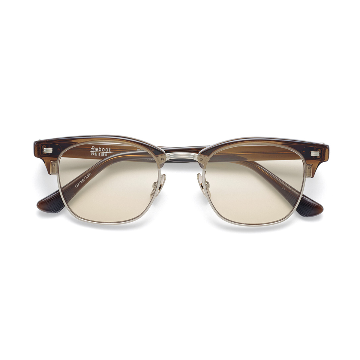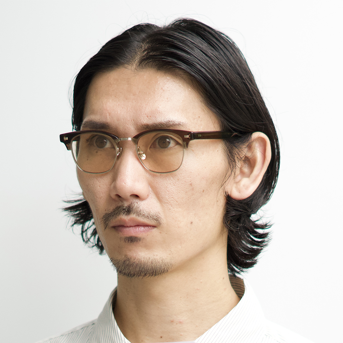 太めの眉パーツと繊細なメタルリムのギャップがインパクトを与えます。