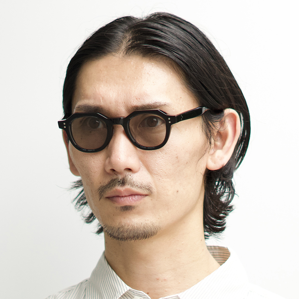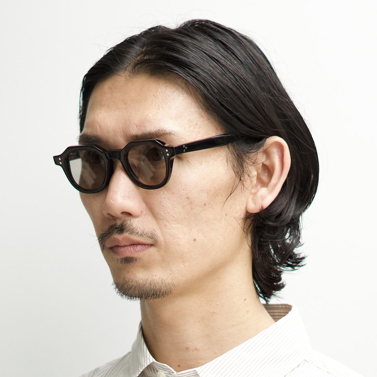丸みの強いウェリントンのレンズシェイプと眉ラインに角を付けたクラウンスタイルが特徴の、フレンチビンテージの空気感を纏うファッション性の高いモデルです。