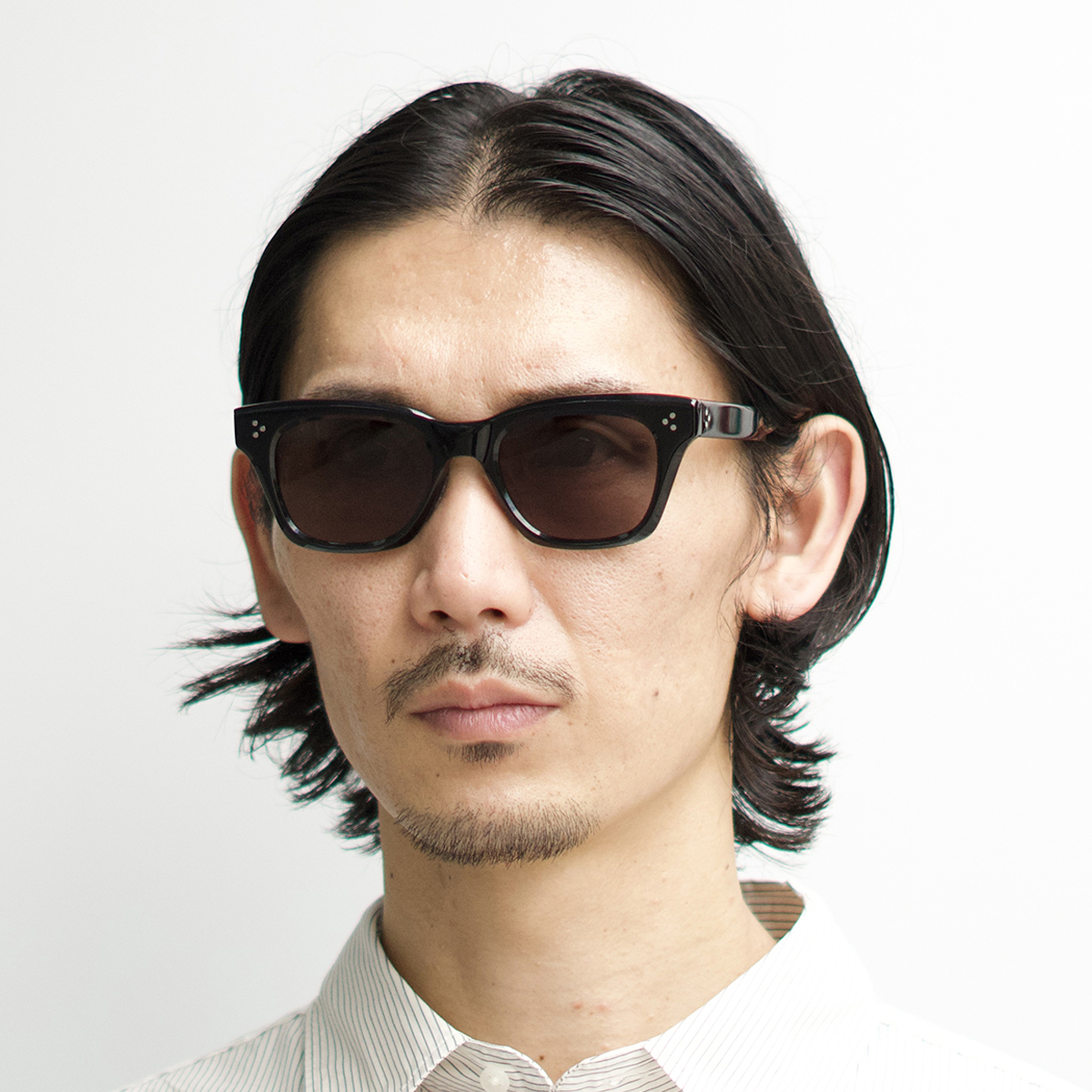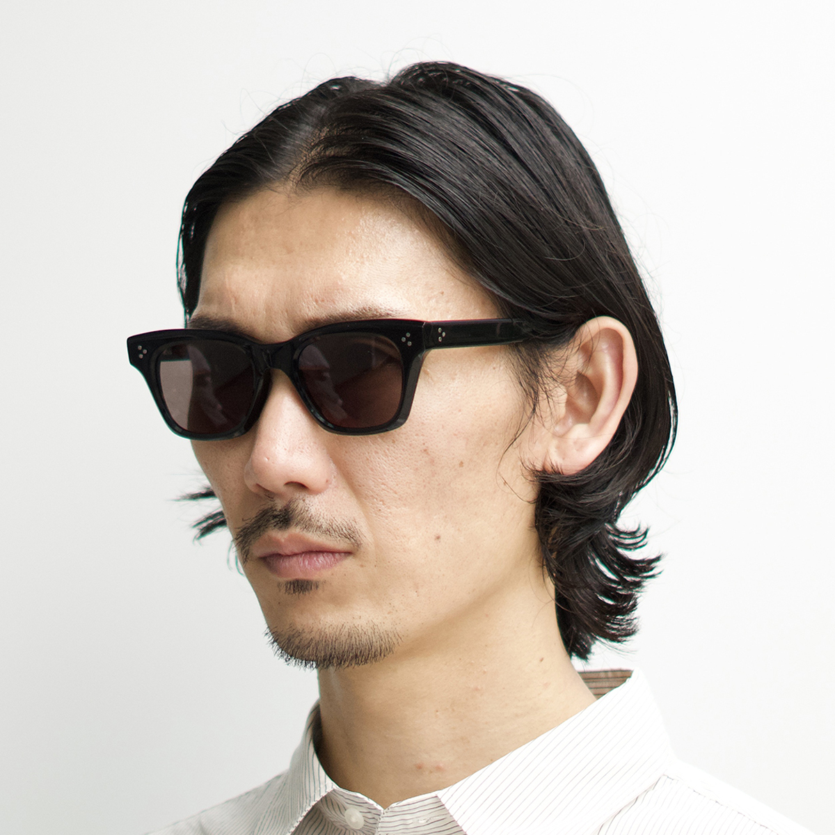 スクエアの要素も持たせたウェリントンのレンズシェイプはマニッシュな印象に。