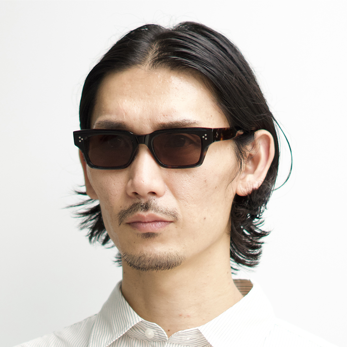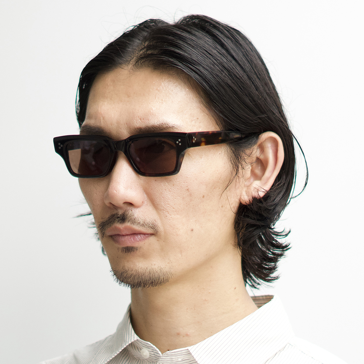 スクエアの要素も持たせたウェリントンのレンズシェイプはマニッシュな印象に。