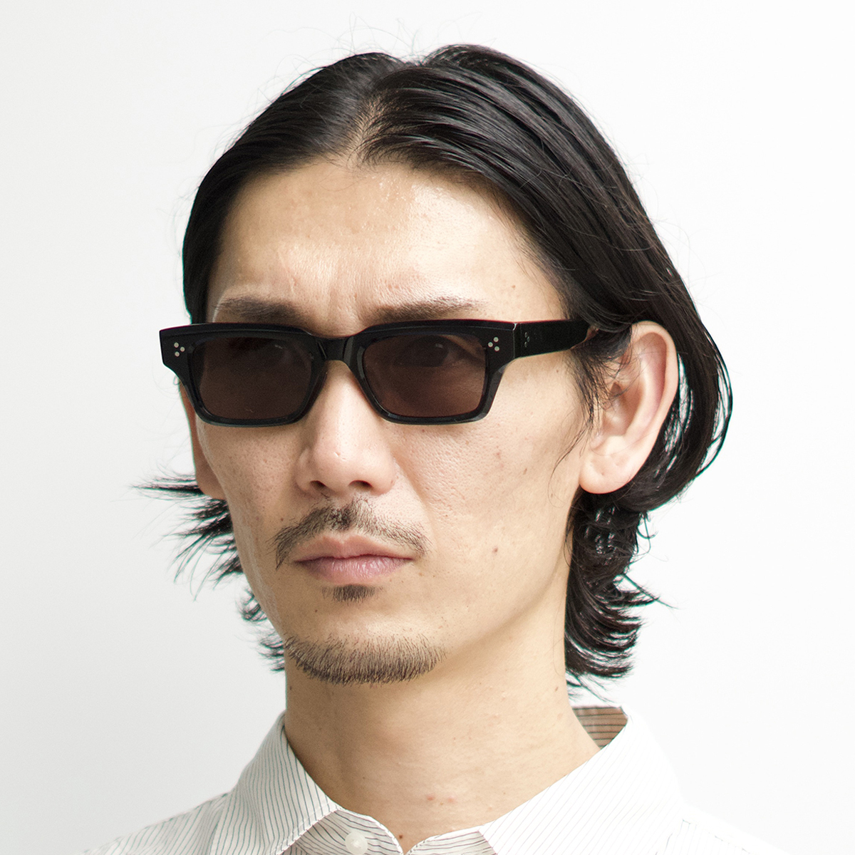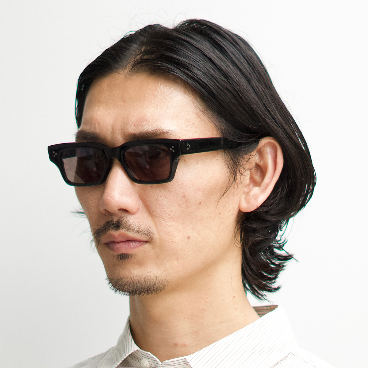 スクエアの要素も持たせたウェリントンのレンズシェイプはマニッシュな印象に。