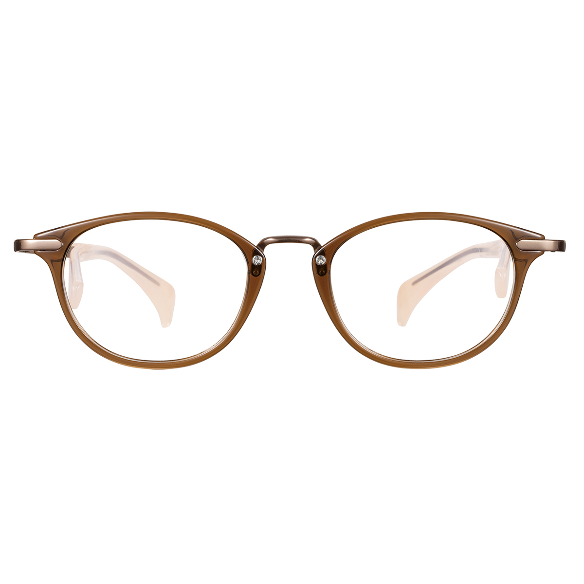 透明感ある樹脂フロントとメタルブリッジが程よくトレンドを感じさせるコンビネーションフレーム。