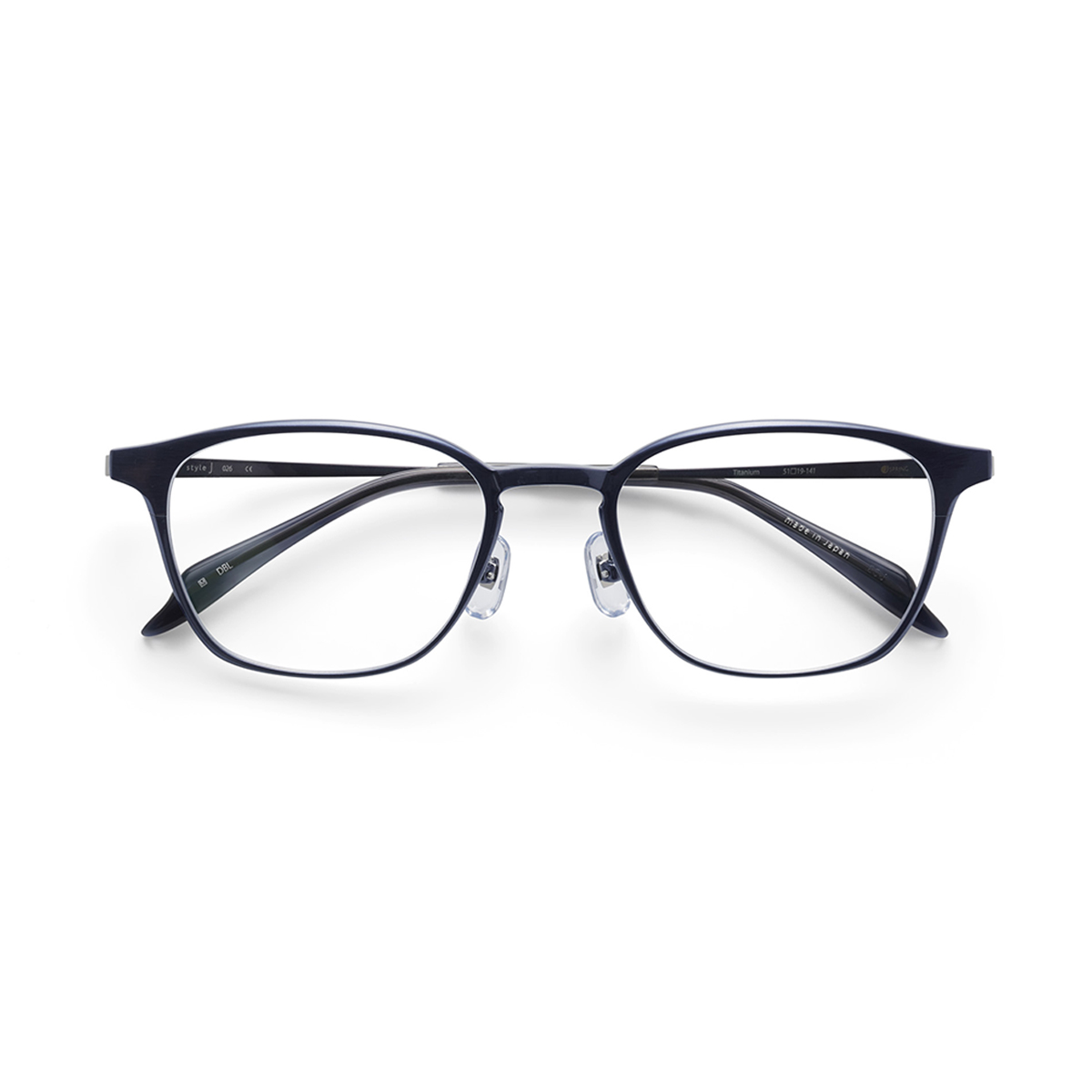 チタン一体成型のフロントは、クラシック過ぎないスクエアとウェリントンの中間的レンズシェイプ。