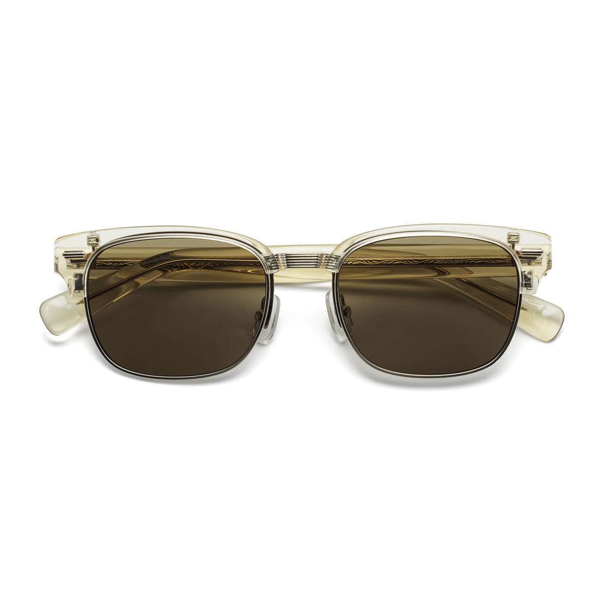 テンプルには繊細な模様が刻まれており、透明感のある貼り合わせ生地を採用したモデルには、彫金柄が透けて見えます。