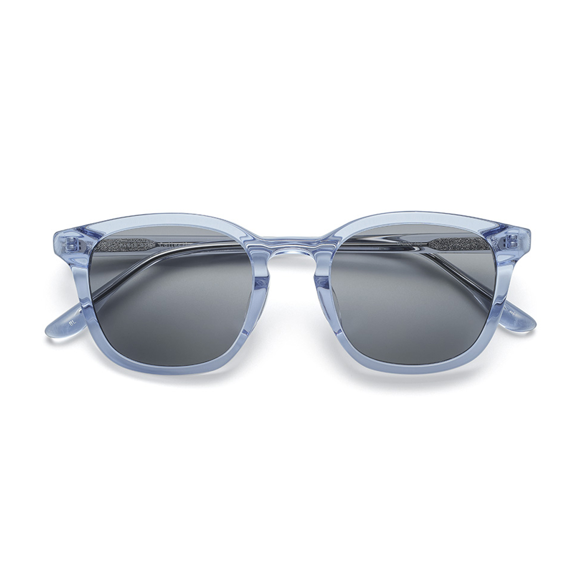 クリアフレームとライトカラーレンズの組み合わせはトレンド感も抜群。