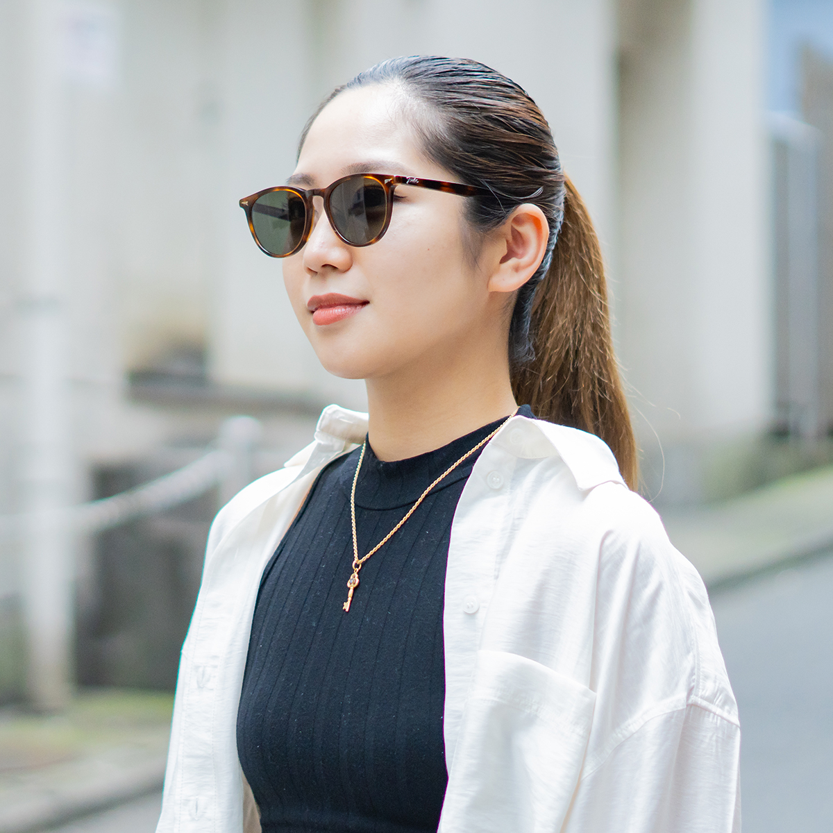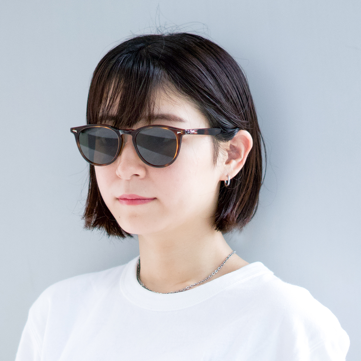 女性でも合わせやすい、丸みのあるボストンシェイプのサングラス。