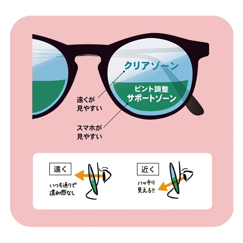 目の負担を軽減させるために、レンズの上部には裸眼と同じように遠くが見える「クリアゾーン」と、下部にはスマホなど近くを見るときにサポートしてくれる度数が入った「リラックスゾーン」を設けています。