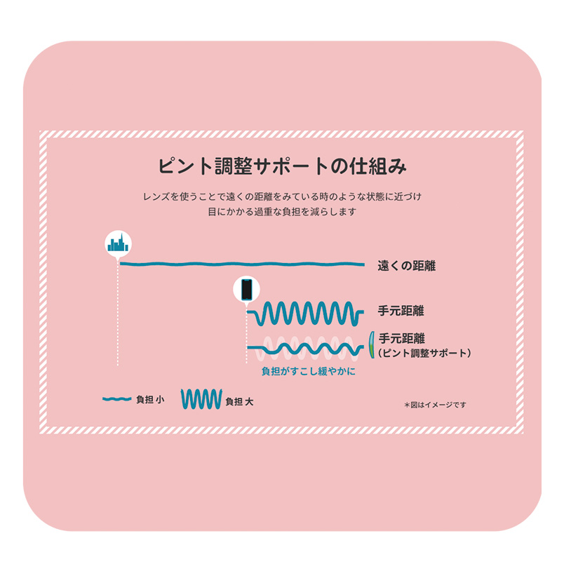 目元はトレンドに合わせてファッショナブルでありながら、大人世代のスマホユーザーが抱える「近くの見づらさ」や「疲れ目」といった悩みを軽減してくれます。【レンズバリエーション ピント調節サポート ブルーライトカット付】